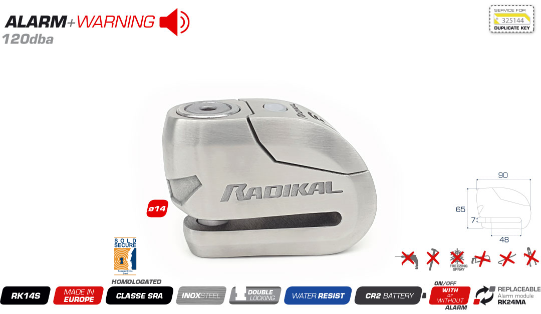 Inspirado en nuestro ya mítico RK15, el RK14S es el antirrobo de disco con alarma para moto de producción más exclusivo jamás fabricado por RADIKAL. Este antirrobo de altas prestaciones tiene un más que resistente cuerpo 100% de acero inoxidable. Con un diseño único y cumpliendo con los máximos estándares de calidad, todo esto y mucho más lo convierte en un producto del cual nos sentimos muy orgullosos.